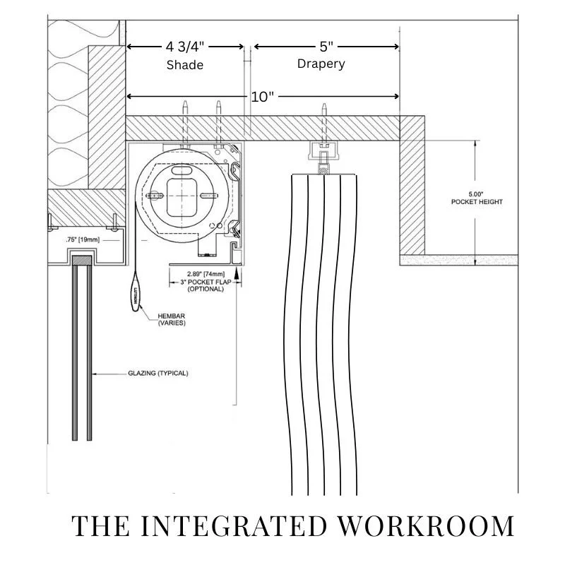 For effective blackout, a ceiling pocket should be a minimum of 6 inches in height. This ensures the top of the panel is fully concealed inside the pocket and that any residual light from the top of the window does not travel past the panel.